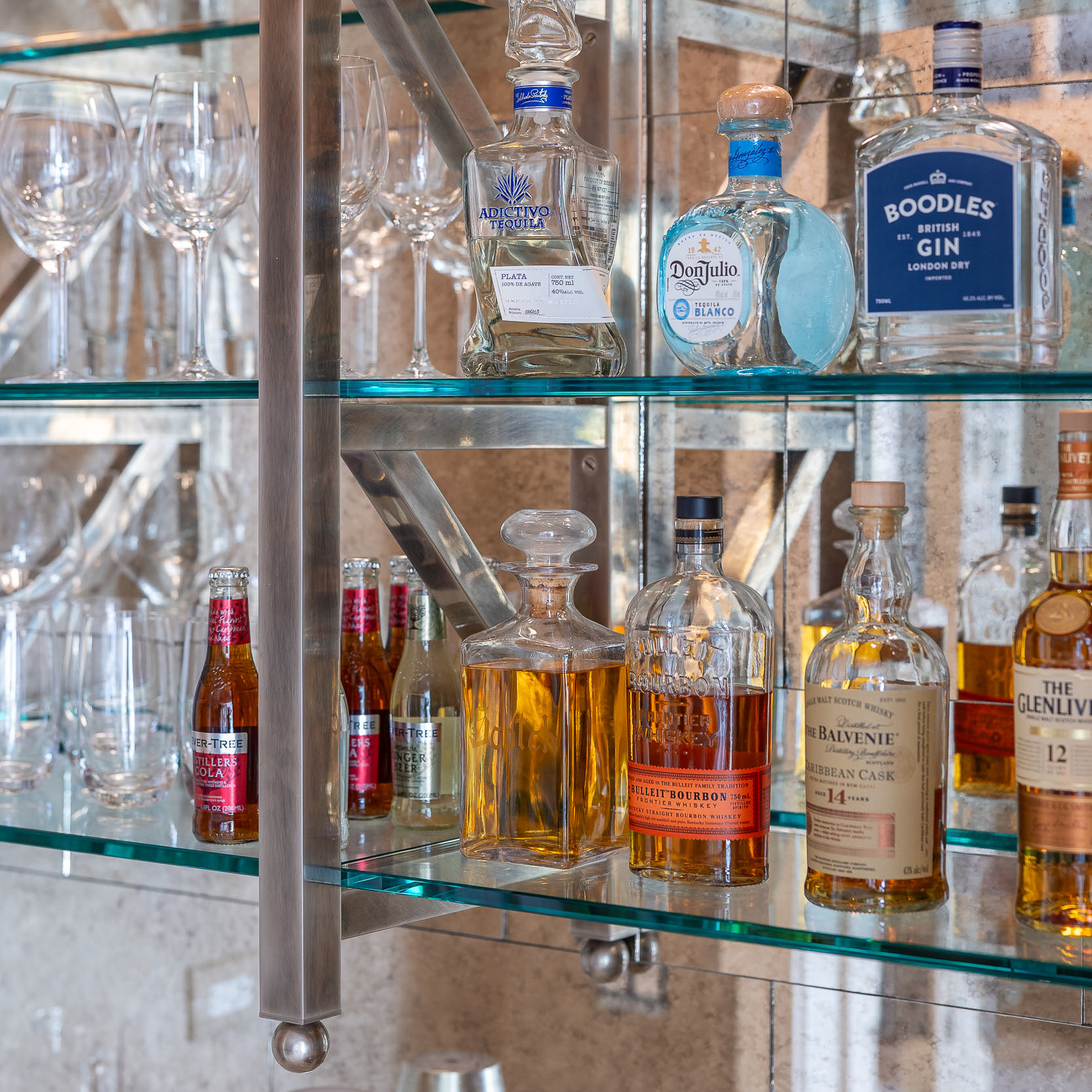 Bar shelving in a smoked nickel finish installed with a background of antique mirror in a Florida home.