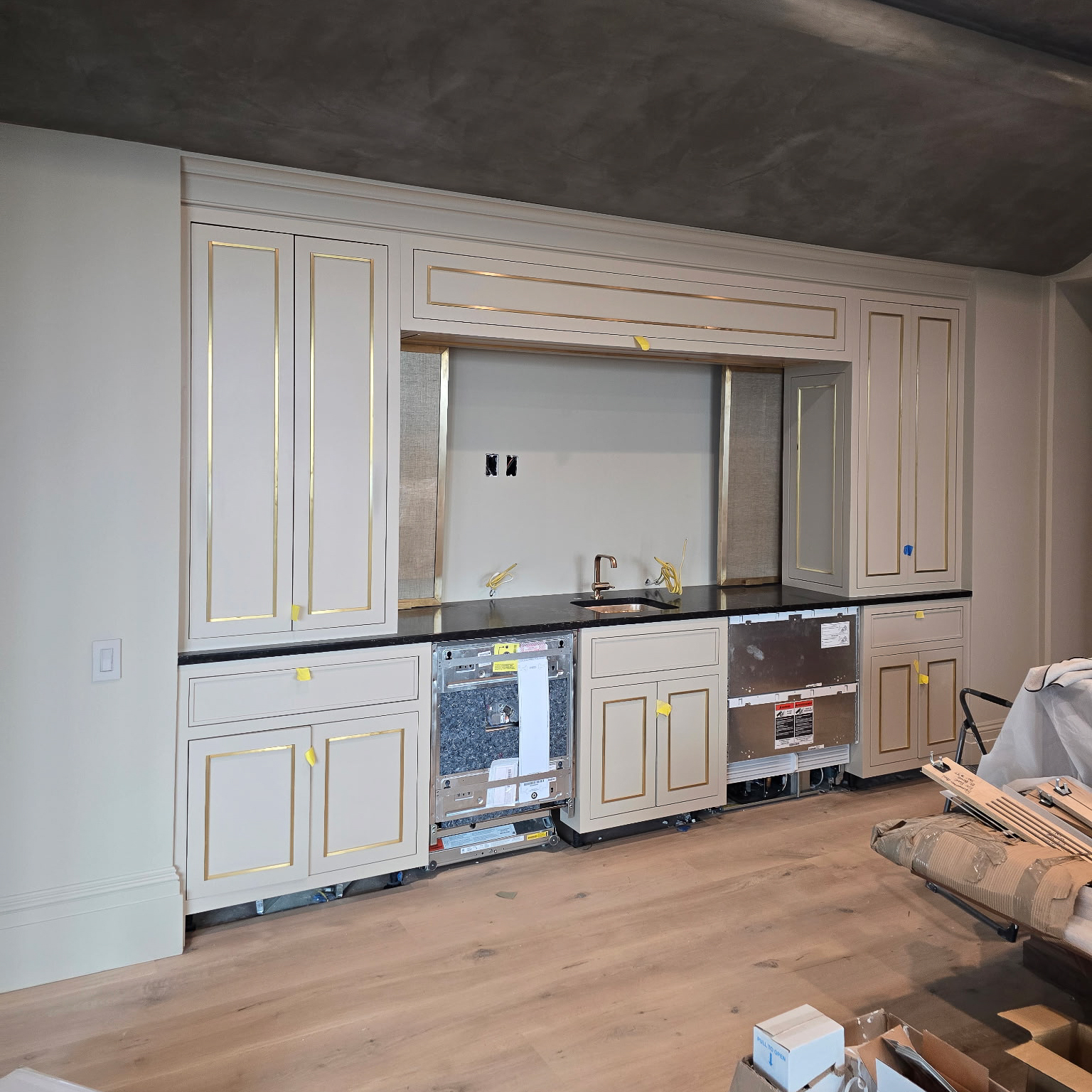 This kitchen installation is still ongoing, but how gorgeous are these brass trimmed cabinets? The space also features sliding framed panels to cover the TV.