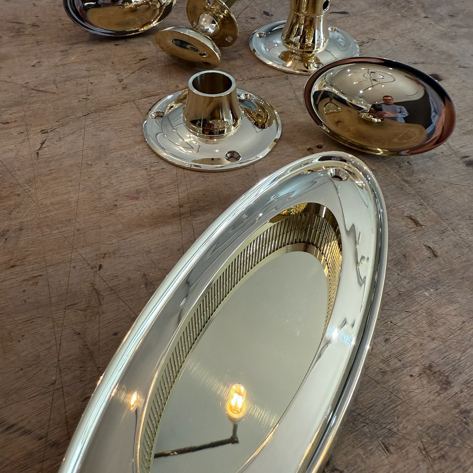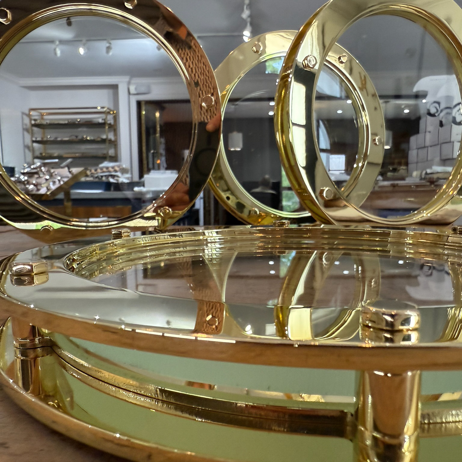 Unlacquered brass port holes are on their way to a Lake Forest club and installed by a very talented millwork shop.