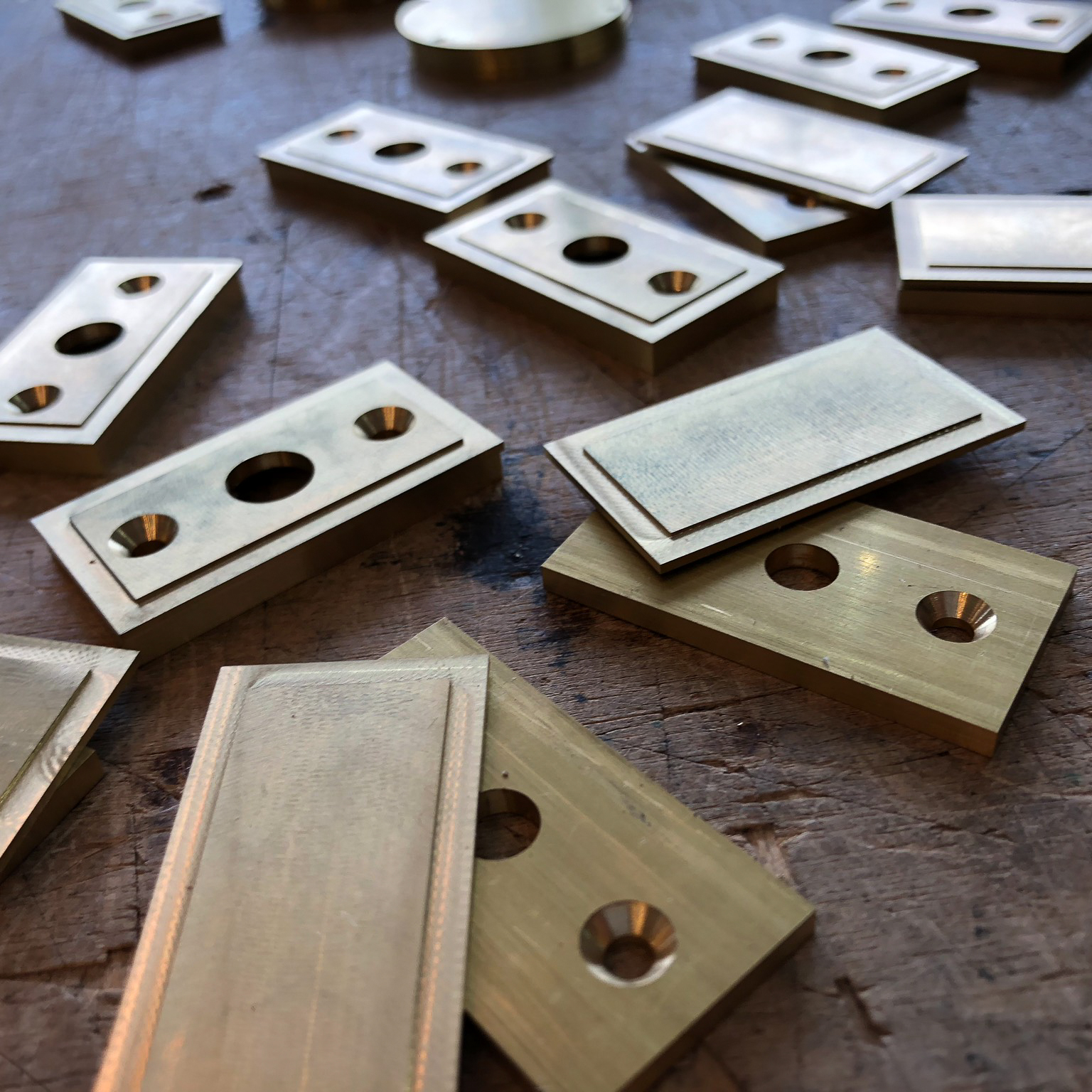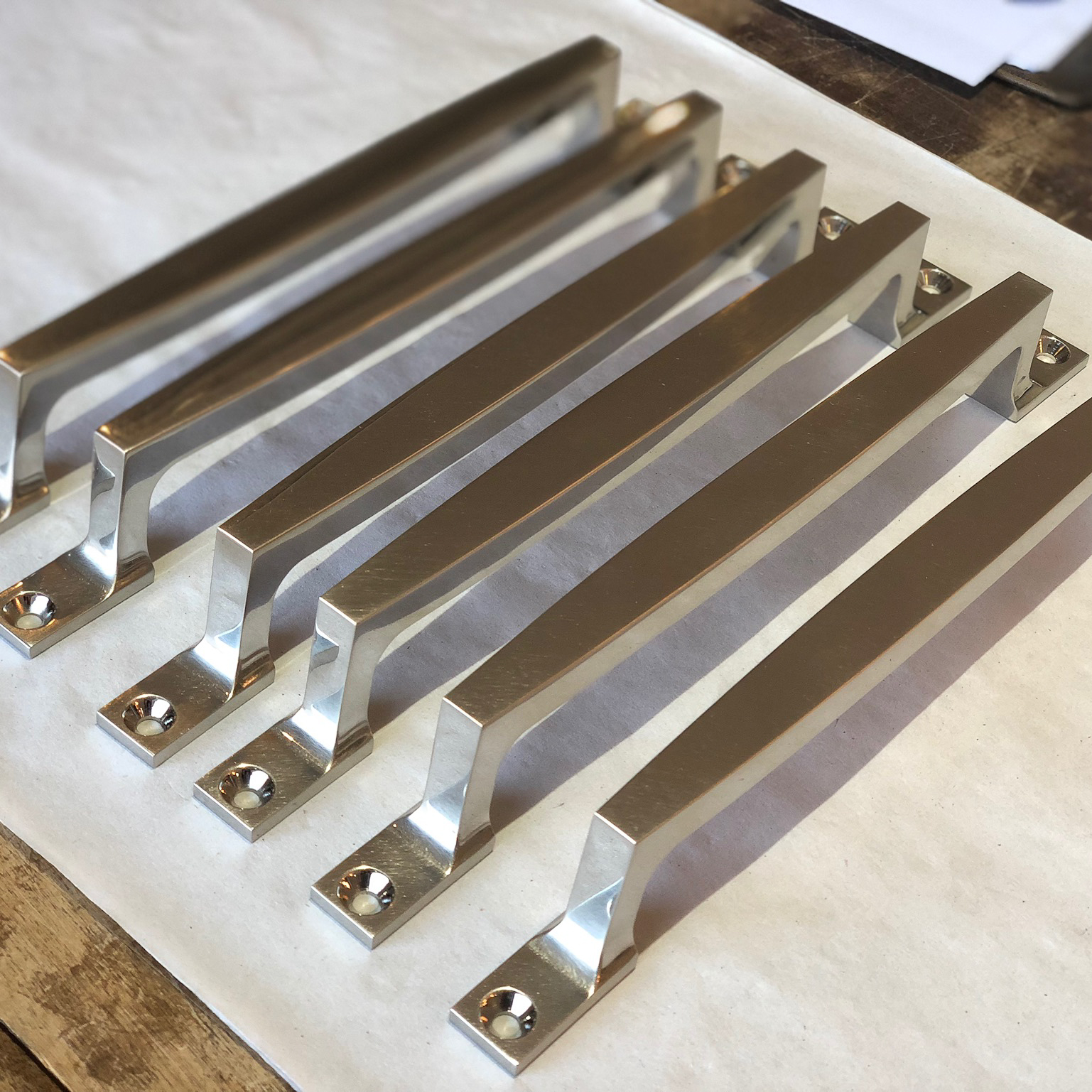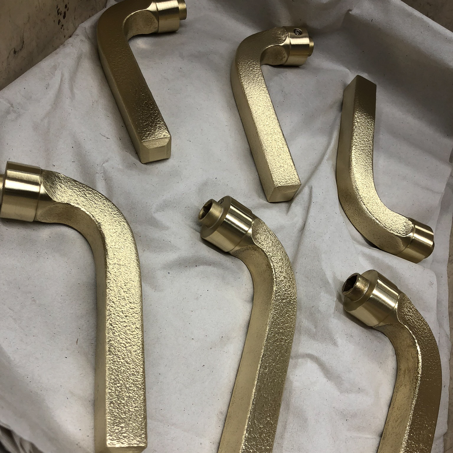 These levers have been hand-hammered and are ready for the final plating and finishing processes.