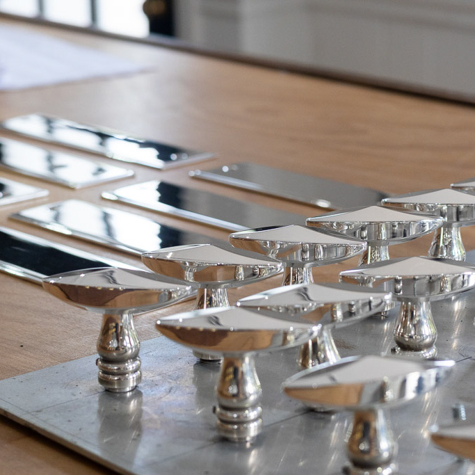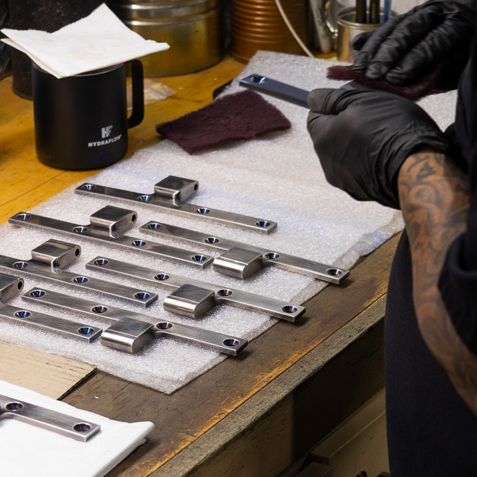 Our hardware goes through a careful hand-finishing process. These Paumelle hinges are almost ready for their final look.