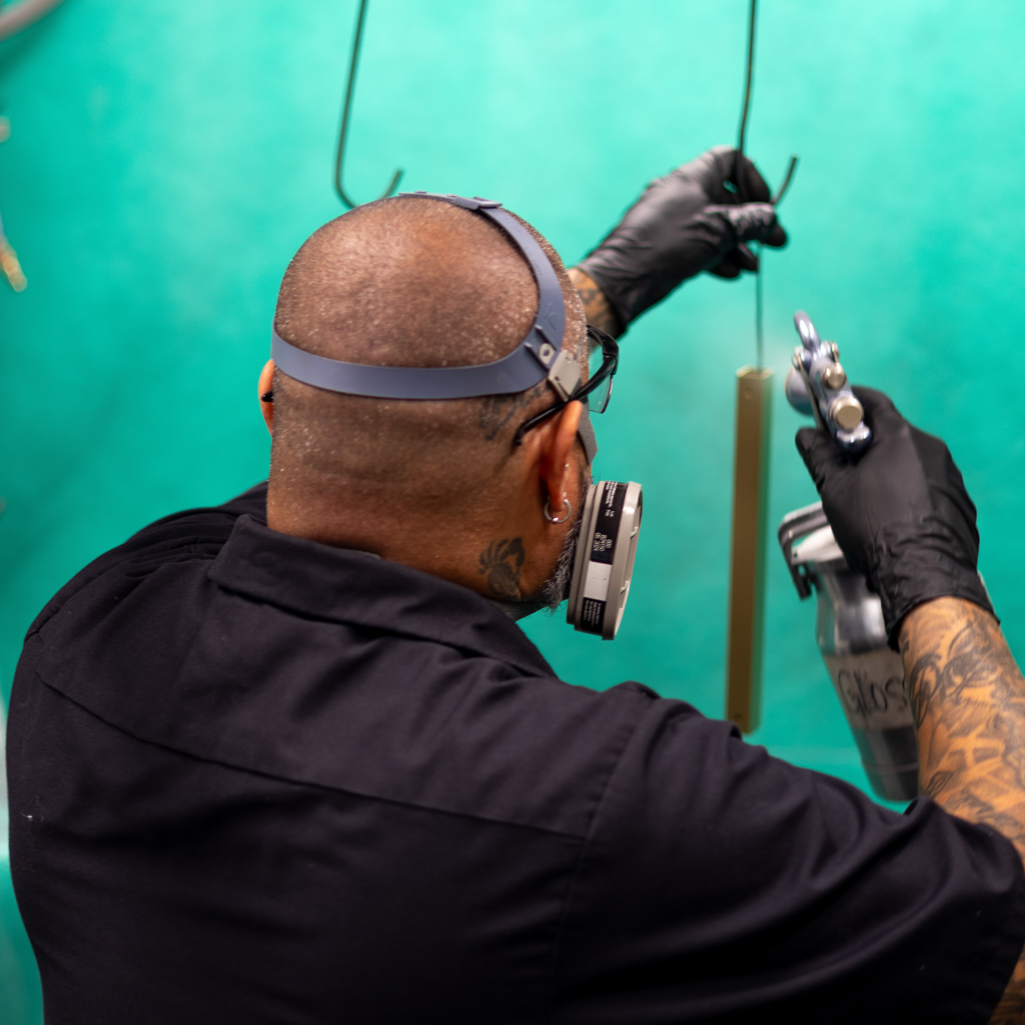 Our artisans are invested in every step of the process. Here, lacquer is carefully applied to a shelf bracket by hand.