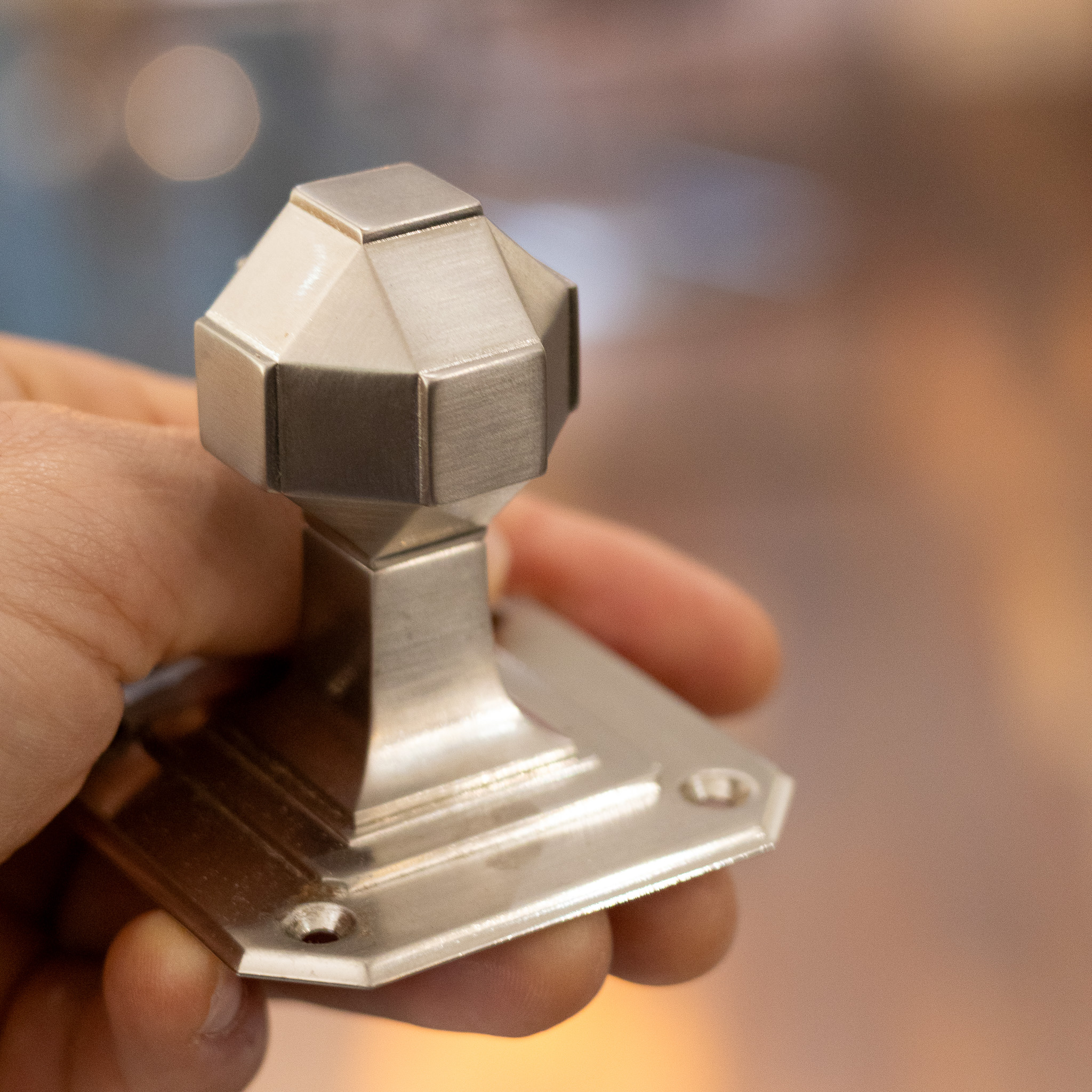 Bespoke hex drawer pulls with turned standoffs shown in a couple finish option