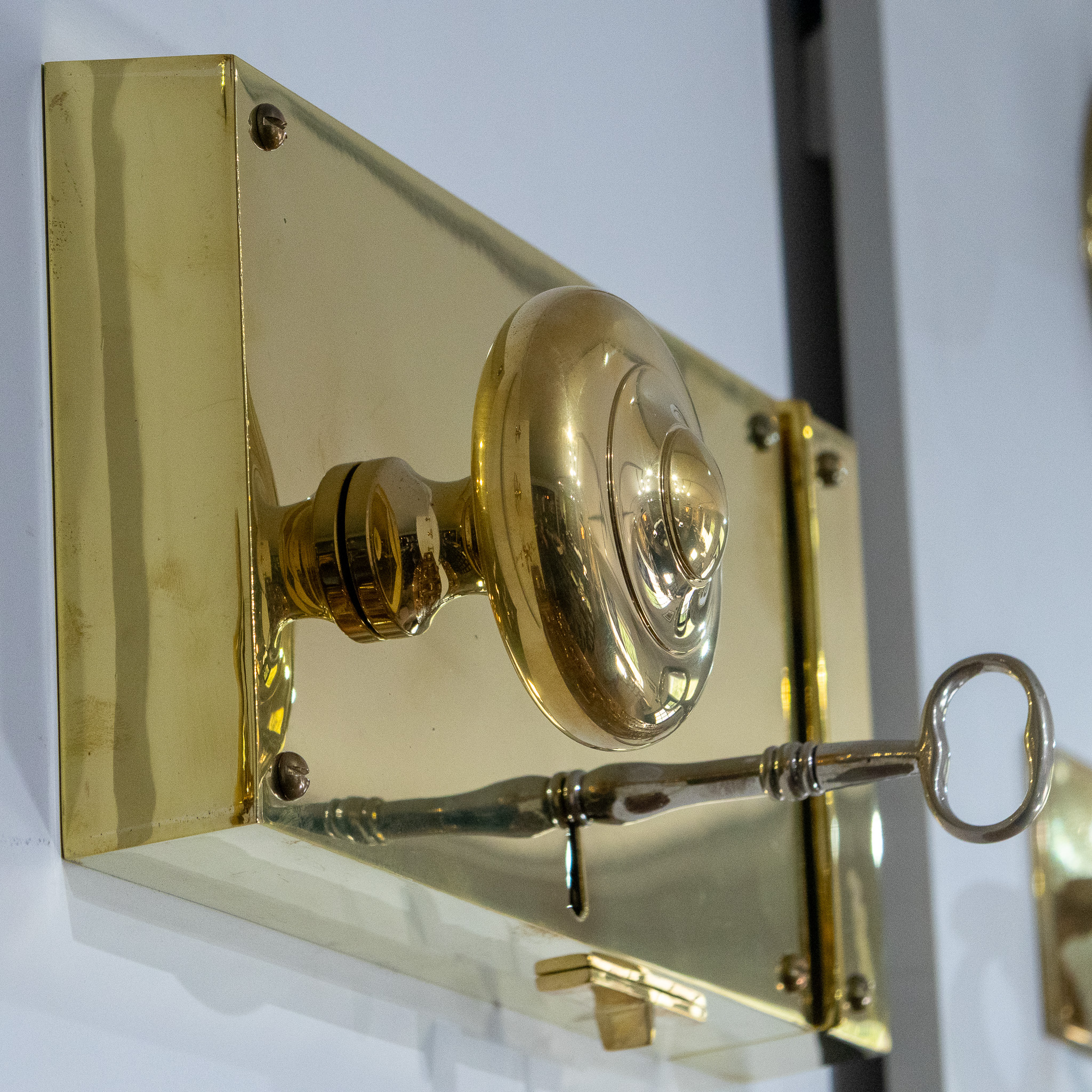 Classical, sleek entry pulls for a row house, finished in lazy butler brass.